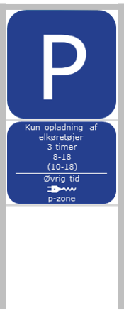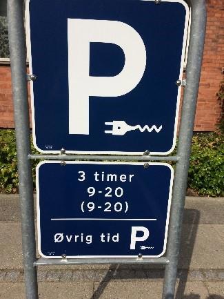 Uden for dette tidsrum gælder tidsbegrænsningen ikke. Ladesymbolet angiver, at parkeringen er reserveret for elbiler og plug-in hybridbiler, samt at parkeringszonen gælder.