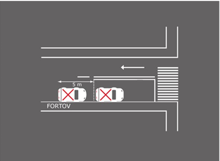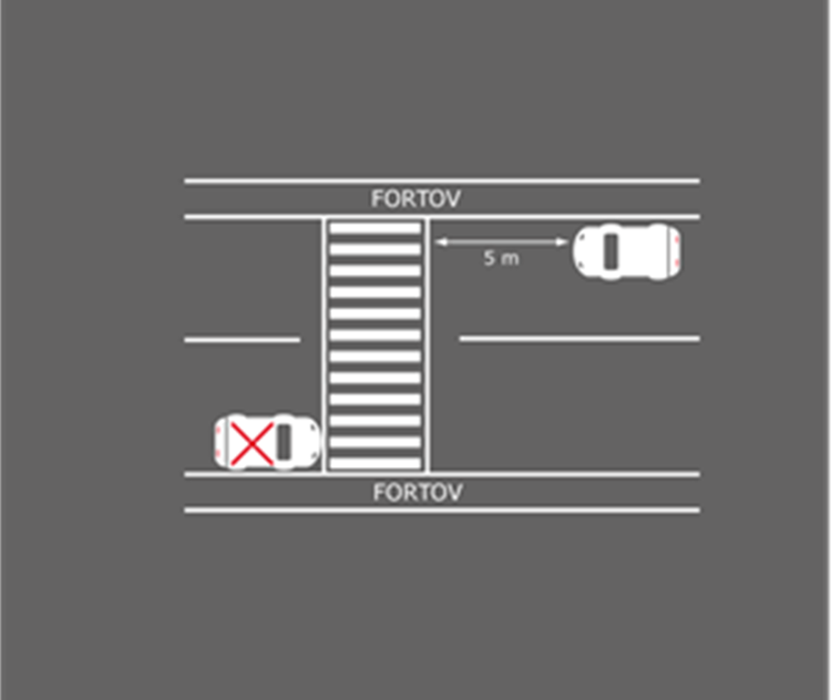Du må ikke standse eller parkere på et fodgængerfelt eller inden for 5 meter før fodgængerfeltet i færdselsretningen.