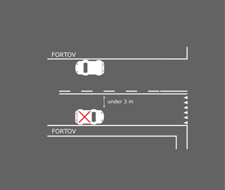 Du må ikke standse eller parkere ved en spærrelinje, hvis afstanden mellem køretøjet og linjen er mindre end 3 meter, og der ikke er en punkteret linje mellem køretøjet og spærrelinjen.