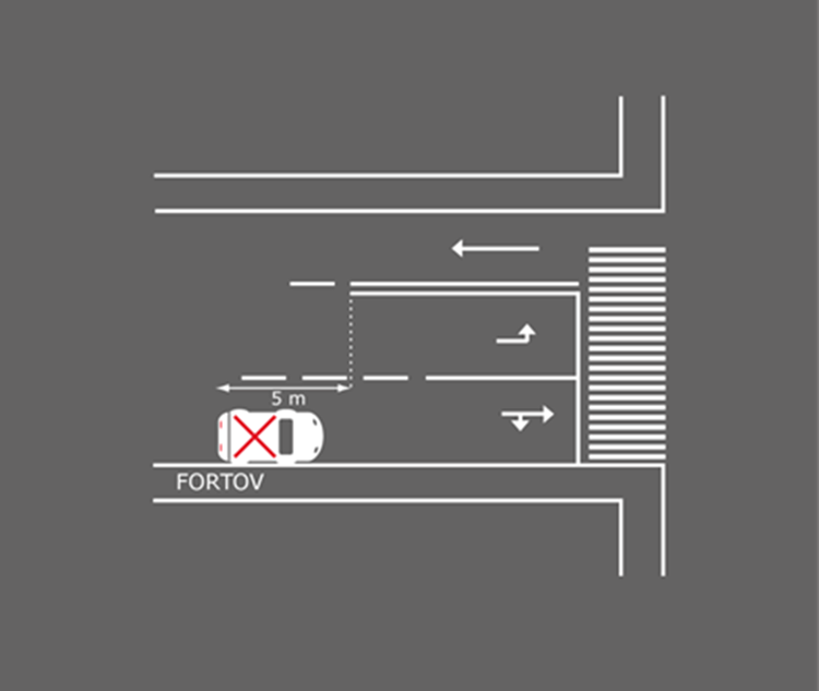 Du må ikke standse eller parkere på en strækning, hvor kørebanen før et vejkryds er inddelt i vognbaner ved hjælp af spærrelinjer. Eller inden for 5 meter før begyndelsen af spærrelinjerne.
