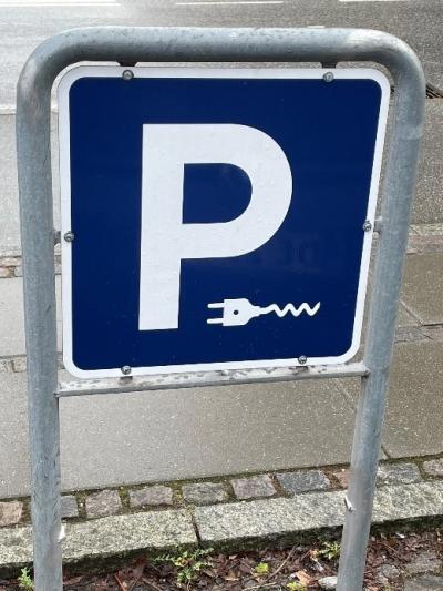 Hovedtavlen angiver, at parkeringspladsen er reserveret til el- og plugin hybridbiler. Reservationen til el- og plugin hybridbiler er angivet ved ladesymbol på tavlerne.